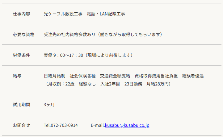 求人情報 社会インフラを構築する世の中に必要な仕事のため安定した業界です。勤務日数もご希望に合わせて選べます。業界未経験でもきっちりスキルを身に付けることができ、将来の独立も可能です。お問合せは、下記いずれかの連絡方法でお気軽にご連絡ください。