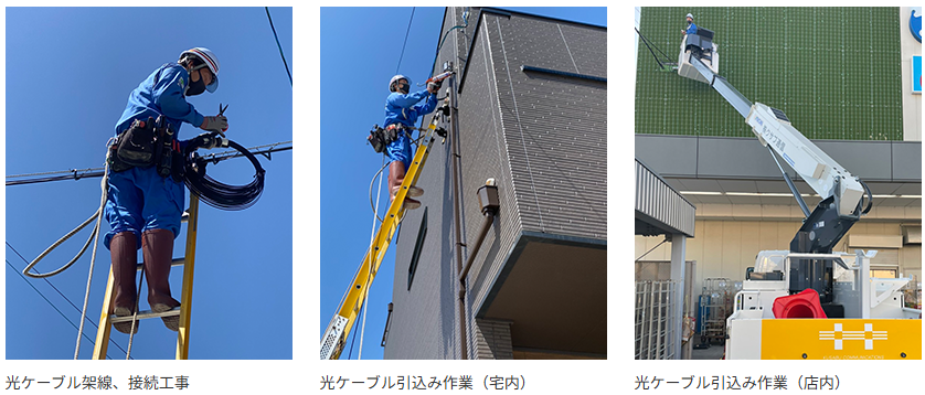 クサブ通信では、光ケーブルの架線・接続工事から住宅や店舗内の引込み作業までトータルに承っています。