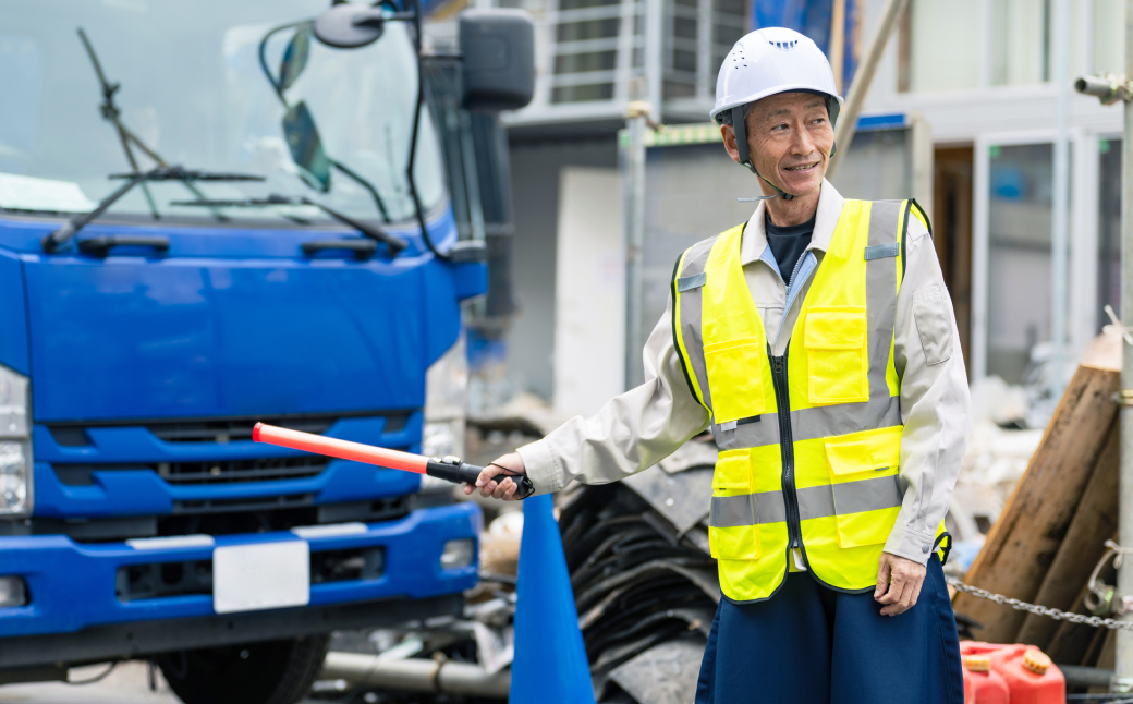 重機や資材搬入の際にも、歩行者や車両が安全に通行できるよう適切に誘導します。